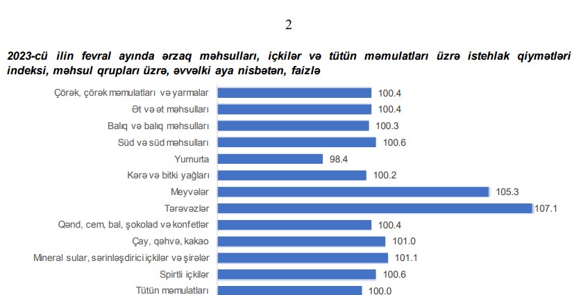 2023-cü ilin fevral ayında ərzaq məhsulları, içkilər və tütün məmulatları üzrə istehlak qiymətləri indeksi əvvəlki aya nisbətən 1,8 faiz, əvvəlki ilin fevral ayına nisbətən 17,1 faiz qalxıb.