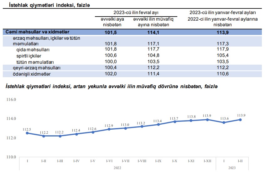 Azərbaycanda illik inflyasiya yenidən sürətlənərək yanvardakı 13,6 faizdən 14,1 faizə yüksəlib.Dövlət Statistika Komitəsinin yaydığı məlumata görə, 2023-cü ilin yanvar-fevral aylarında istehlak qiymətləri indeksi 2022-ci ilin yanvar-fevral aylarına nisbətən 13,9 faiz, o cümlədən ərzaq məhsulları, içkilər və tütün məmulatları üzrə 17,3 faiz, qeyri-ərzaq məhsulları üzrə 12,2 faiz, əhaliyə göstərilmiş ödənişli xidmətlər üzrə 10,6 faiz tartıb. 2023-cü ilin fevral ayında istehlak qiymətləri indeksi əvvəlki aya nisbətən 1,5 faiz, əvvəlki ilin fevral ayına nisbətən 14,1 faiz yüksəlib.