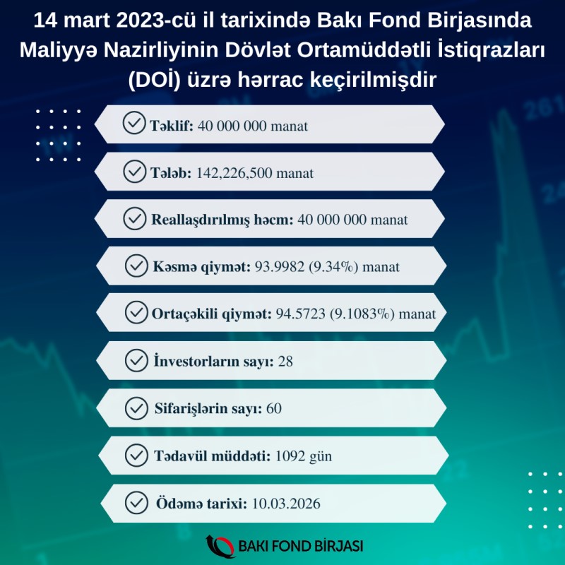 14 mart 2023-cü il tarixində Bakı Fond Birjasında Azərbaycan Respublikası Maliyyə Nazirliyinin AZ0201040067 ISIN-li, 40 milyon manat həcmində, 1092 gün olan tədavül müddətli dövlət ortamüddətli istiqrazlarının (DOİ) yerləşdirilməsi üzrə hərrac keçirilib.