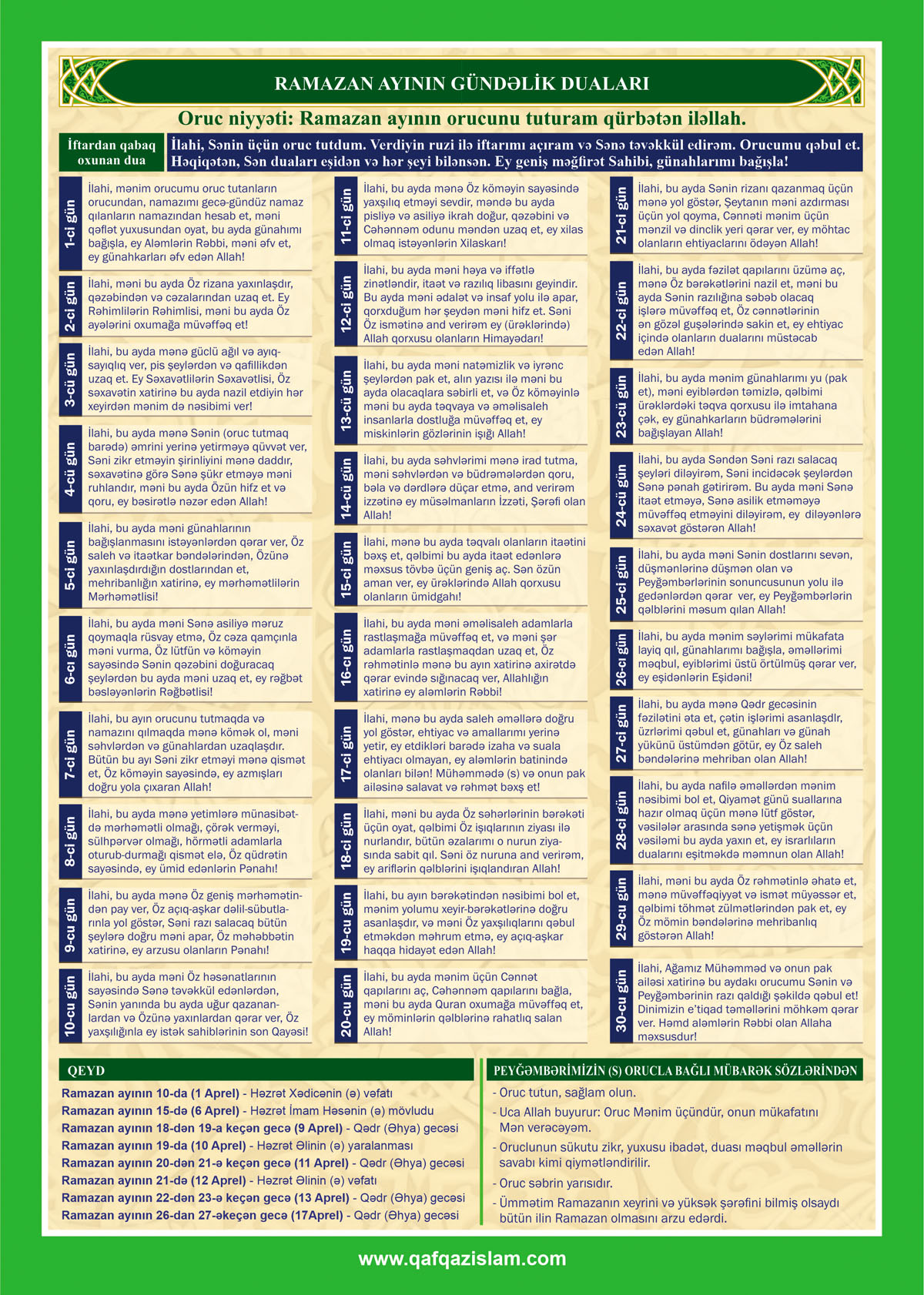 Təqvimdə Ramazan ayının gündəlik duaları da yer alıb.
