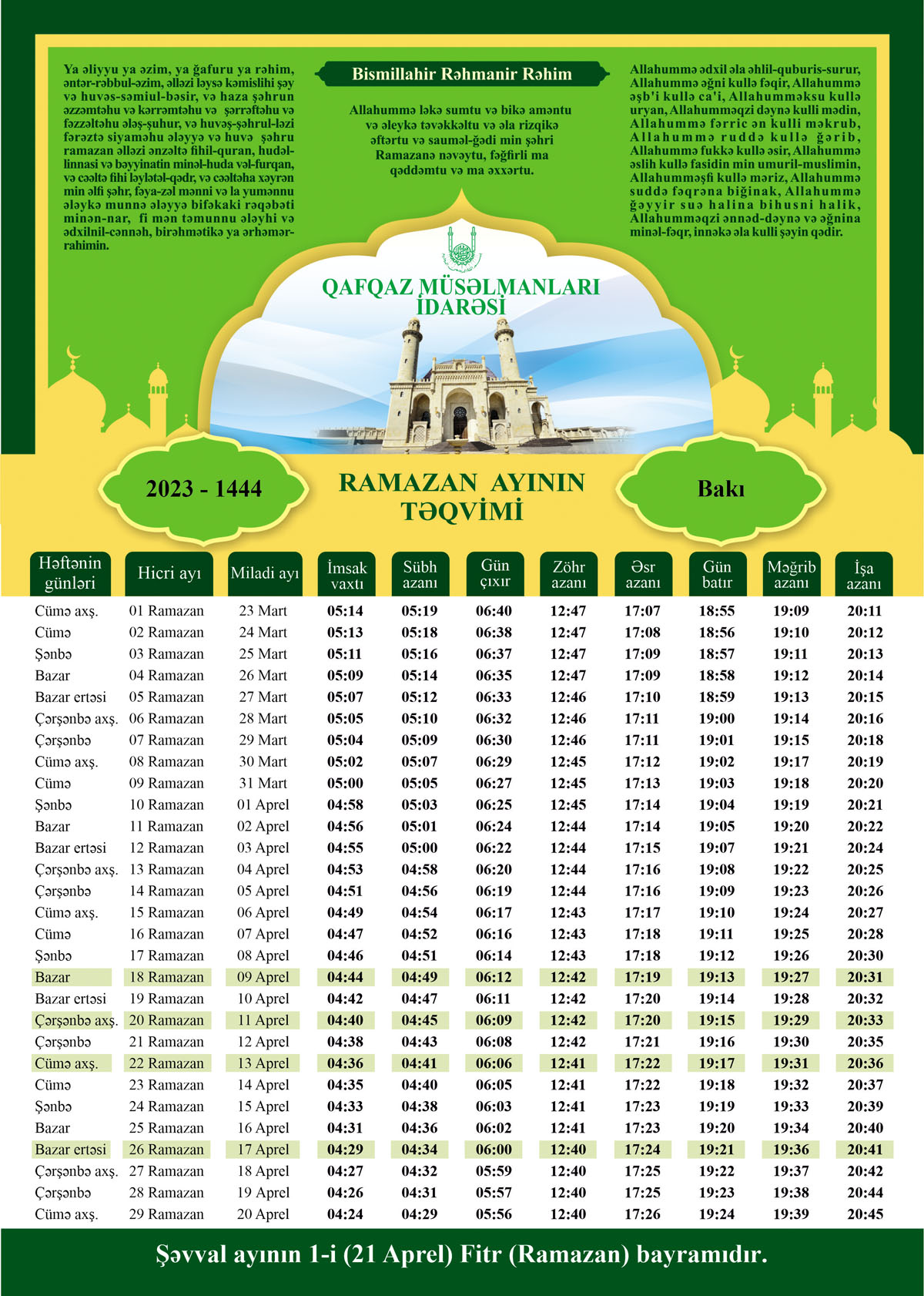 Marja.az xəbər verir ki, Qafqaz Müsəlmanları İdarəsinin hazırladığı Ramazan ayının xüsusi təqvimi Bakı və Abşeron şəri vaxt ölçüsünə uyğun tərtib edilib.