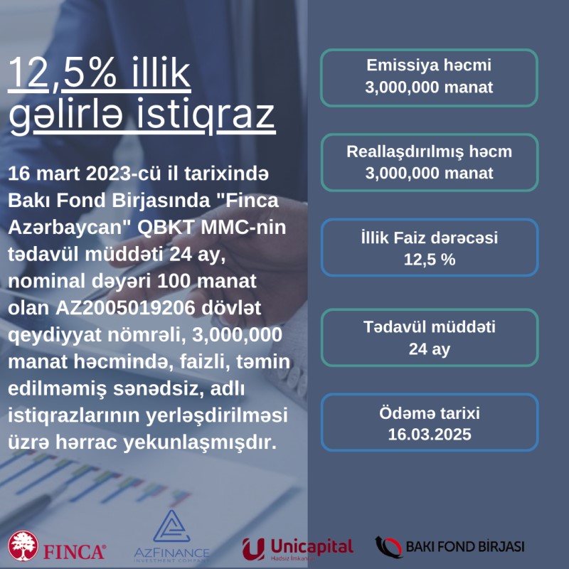 16 mart 2023-cü il tarixində Bakı Fond Birjasında "Finca Azərbaycan" QBKT MMC-nin tədavül müddəti 24 ay, nominal dəyəri 100 manat olan AZ2005019206 dövlət qeydiyyat nömrəli, 3 milyon manat həcmində, faizli, təmin edilməmiş sənədsiz, adlı istiqrazlarının yerləşdirilməsi üzrə hərrac yekunlaşıb.
