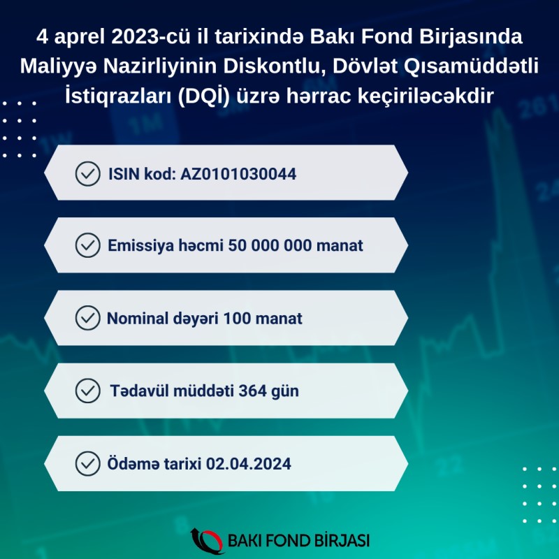 4 aprel 2023-cü il tarixində Bakı Fond Birjasında Maliyyə Nazirliyinin Diskontlu, Dövlət Qısamüddətli İstiqrazları (DQİ) üzrə hərrac keçiriləcəkdir.