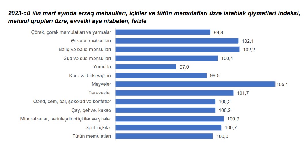 2023-cü ilin mart ayında ərzaq məhsulları, içkilər və tütün məmulatları üzrə istehlak qiymətləri indeksi əvvəlki aya nisbətən 1,3 faiz, əvvəlki ilin mart ayına nisbətən 16,8 faiz artıb.
