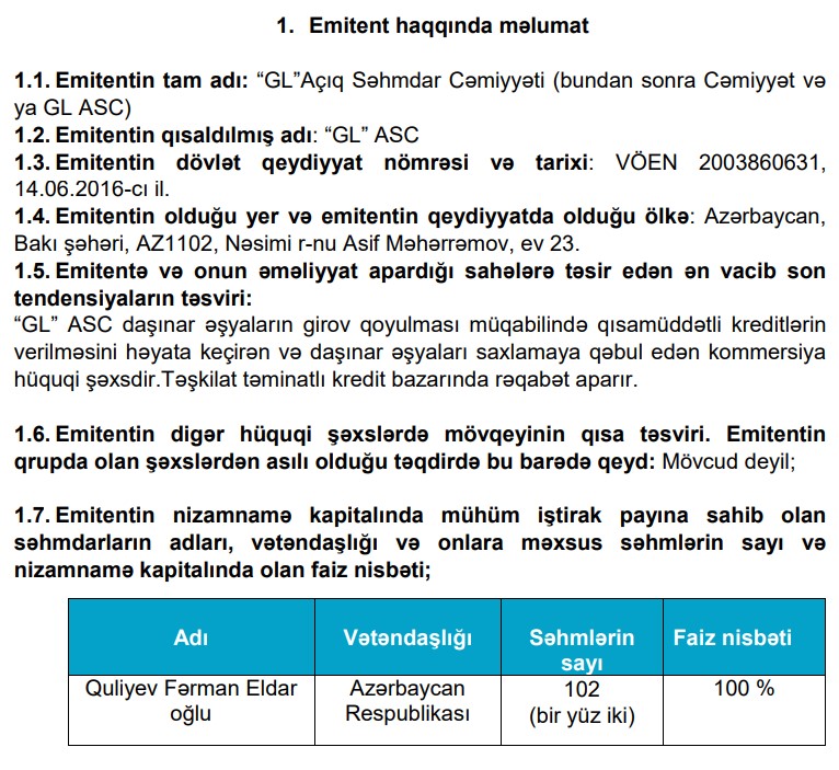 "GL" Açıq Sәhmdar Cәmiyyәtinin nizamnamə kapitalının 100%-i Quliyev Fərman Eldar oğluna məxsusdur.