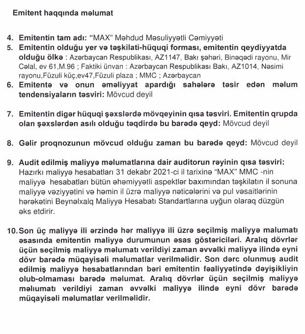 Çap avadanlıqları üzrə xidmətlər göstərən "MAX" MMC hər birinin nominal dəyəri 1000 manat olan 500 ədəd istiqraz buraxır.