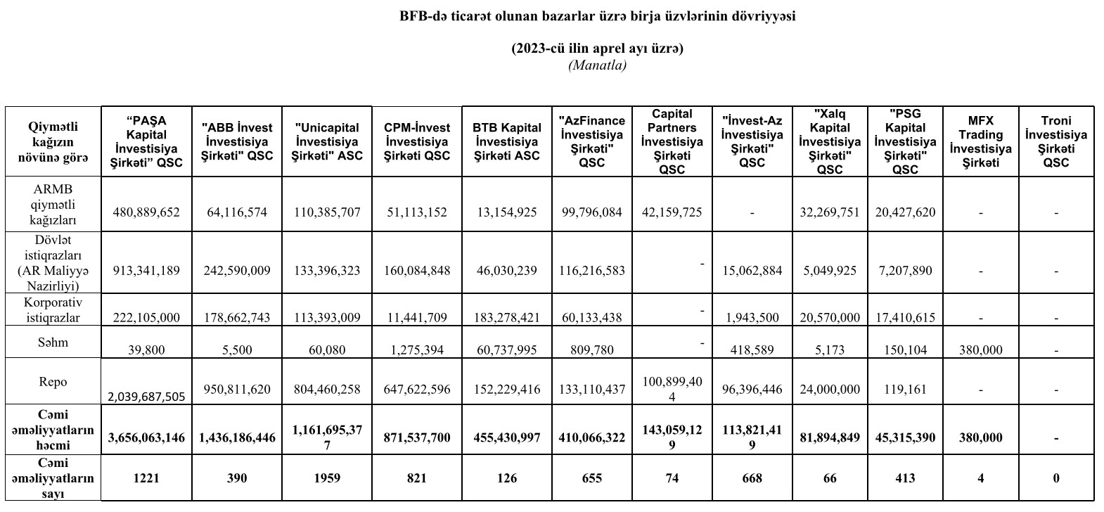 Marja.az Birjaya istinadən xəbər verir ki, “PAŞA Kapital İnvestisiya Şirkəti” QSC 3 milyard 656 milyon 63 min manat dövriyyə ilə 1-ci, "ABB İnvest İnvestisiya Şirkəti" QSC 1 milyard 436 milyon 186 min manat dövriyyə ilə 2-ci və "Unicapital İnvestisiya Şirkəti" ASC 1 milyard 161 milyon 695 min manat dövriyyə ilə 3-cü yerdə olub.