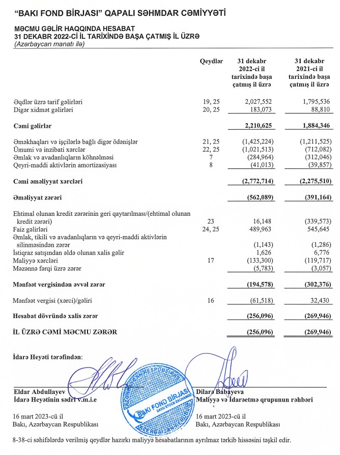 Marja.az QSC-nin 31 dekabr 2022-ci il tarixində başa çatmış il üzrə Maliyyə Hesabatlarının Beynəlxalq Standartlarına uyğun Hazırlanmış Maliyyə Hesabatlarına istinadən xəbər verir ki, "Bakı Fond Birjası"nın cəmi gəlirləri 2021-ci ildə 1 milyon 884 min manat ikən, 2022-ci ildə 2 milyon 211 min manat təşkil edib (327 min manat artıb).