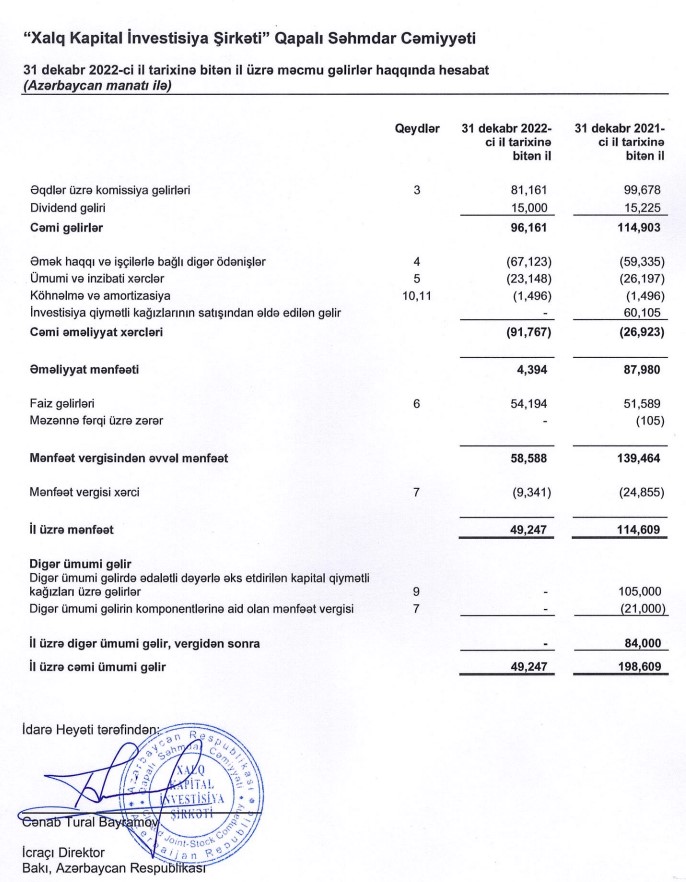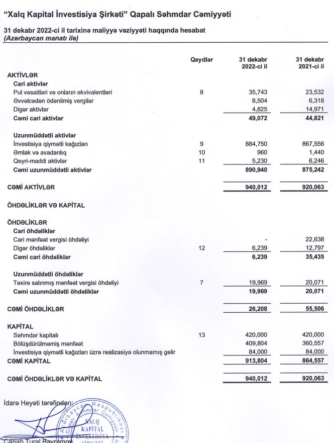 Ötən il “Xalq Kapital" 54 min 194 manat faiz gəliri də əldə edib (2021-ci ildə 51 min 589 manat).
