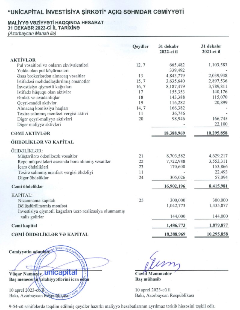 Marja.az şirkətin 31 dekabr 2022-ci il tarixində başa çatmış il üzrə Maliyyə Hesabatlarının Beynəlxalq Standartlarına uyğun hazırlanmış Maliyyə Hesabatlarına istinadən xəbər verir ki, ötən il “Unicapital"ın faiz gəlirləri 311 min manat təşkil edib (2021-ci ildə 672 min manat).