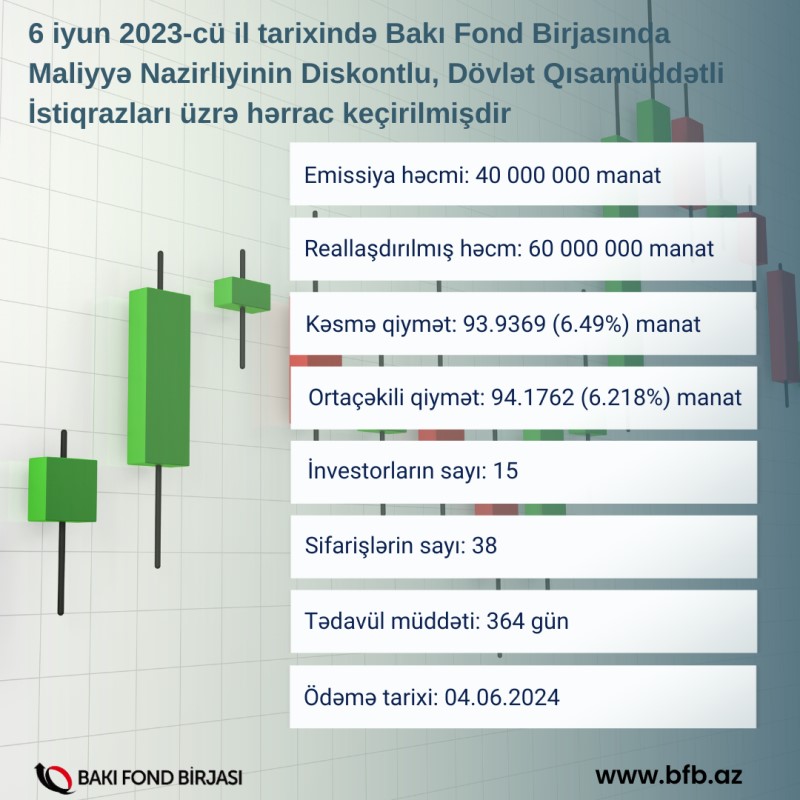 Maliyyə Nazirliyinin qərarına əsasən istiqrazların kəsmə qiyməti 93.9369 (6.49 %) manat, orta ölçülmüş qiyməti isə 94.1762 (6.218%) manat olaraq müəyyən edilib.