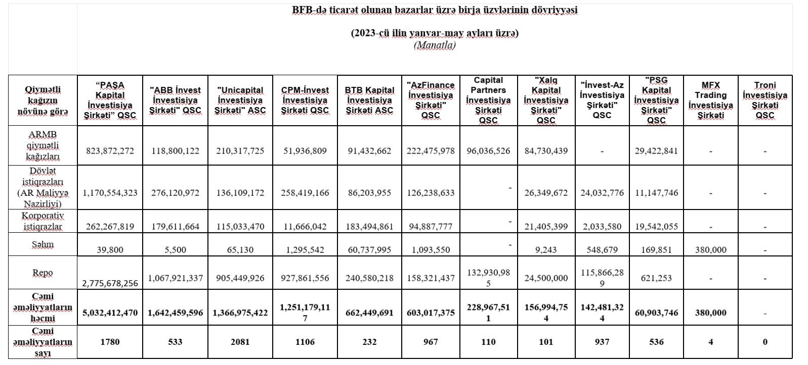 Marja Birja-ya istinadən xəbər verir ki, 5 milyard 32 milyon 412 min 470 manat dövriyyə ilə “PAŞA Kapital İnvestisiya Şirkəti” QSC 1-ci, 1 milyard 642 milyon 459 min 596 manat dövriyyə ilə "ABB İnvest İnvestisiya Şirkəti" QSC 2-ci və 1 milyard 366 milyon 975 min 422 manat dövriyyə ilə "Unicapital İnvestisiya Şirkəti" ASC 3-cü olub.