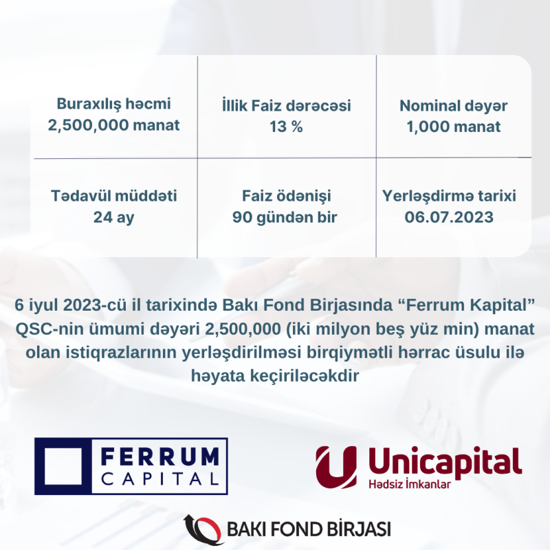6 iyul 2023-cü il tarixində Bakı Fond Birjasında “Ferrum Kapital” QSC-nin ümumi dəyəri 2 milyon 500 min manat olan istiqrazlarının yerləşdirilməsi birqiymətli hərrac üsulu ilə həyata keçiriləcəkdir.