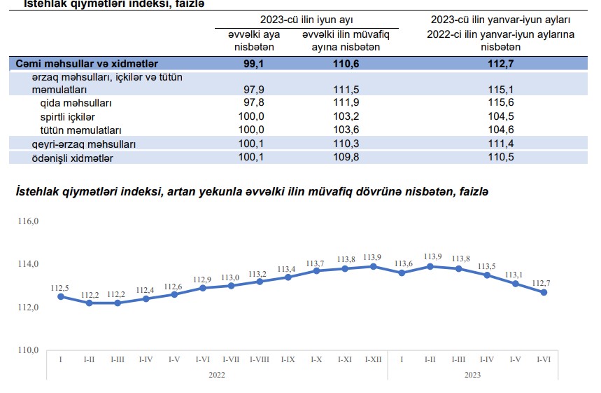 Azərbaycanda illik inflyasiya 11,5 faizdən 10,6 faizə yavaşlayıb. Aylıq müqayisədə isə qiymətlərin ümumi səviyyəsi düşüb (deflyasiya).2023-cü ilin yanvar-iyun aylarında istehlak qiymətləri indeksi (inflyasiya göstəricisi) 2022-ci ilin yanvar-iyun aylarına nisbətən 12,7 faiz, o cümlədən ərzaq məhsulları, içkilər və tütün məmulatları üzrə 15,1 faiz, qeyri-ərzaq məhsulları üzrə 11,4 faiz, əhaliyə göstərilmiş ödənişli xidmətlər üzrə 10,5 faiz artıb.