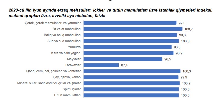 2023-cü ilin iyun ayında ərzaq məhsulları, içkilər və tütün məmulatları üzrə istehlak qiymətləri indeksi əvvəlki aya nisbətən 2,1 faiz azalıb, əvvəlki ilin iyun ayına nisbətən 11,5 faiz artıb.