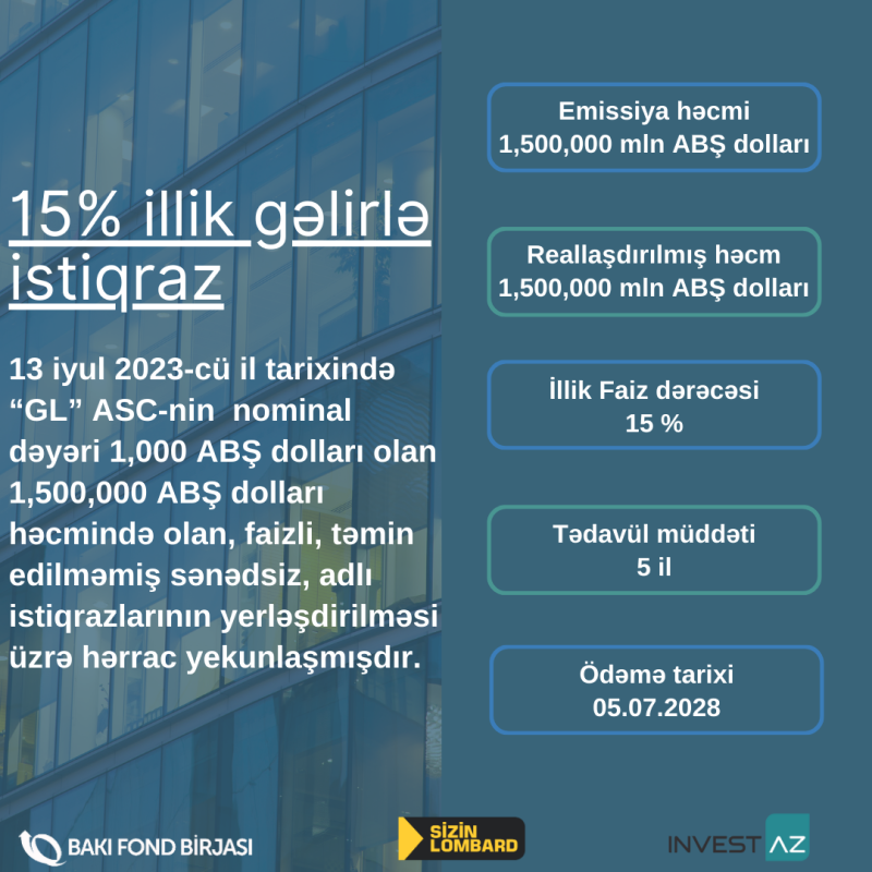 “GL” ASC-nin istiqrazlarının yerləşdirilməsi üzrə hərrac keçirilmişdir13 iyul 2023-cü il tarixində Bakı Fond Birjasında “GL” ASC-nin tədavül müddəti 5 təqvim ili, nominal dəyəri 1,000 ABŞ dolları olan AZ2010020280 dövlət qeydiyyat nömrəli, 1,500,000 (bir milyon beş yüz min ) ABŞ dolları həcmində olan, faizli, təmin edilməmiş sənədsiz, adlı istiqrazlarının yerləşdirilməsi üzrə hərrac yekunlaşmışdır.