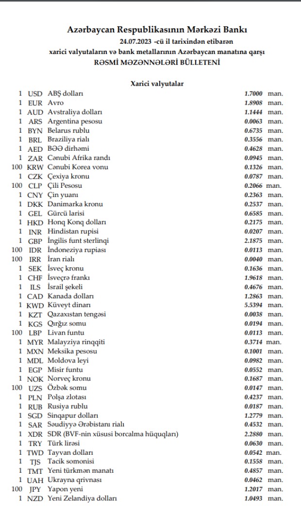 Rəsmi məzənnələr açıqlandı