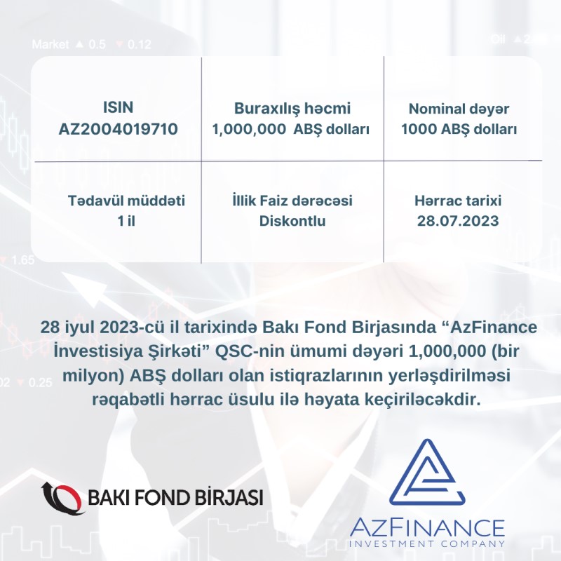 28 iyul 2023-cü il tarixində Bakı Fond Birjasında “AzFinance İnvestisiya Şirkəti” QSC-nin ümumi dəyəri 1 milyon ABŞ dolları olan istiqrazlarının yerləşdirilməsi rəqabətli hərrac üsulu ilə həyata keçiriləcəkdir.