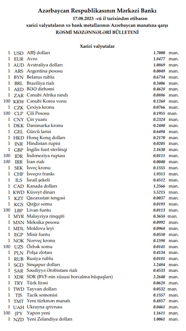 Rəsmi məzənnələr açıqlandı
