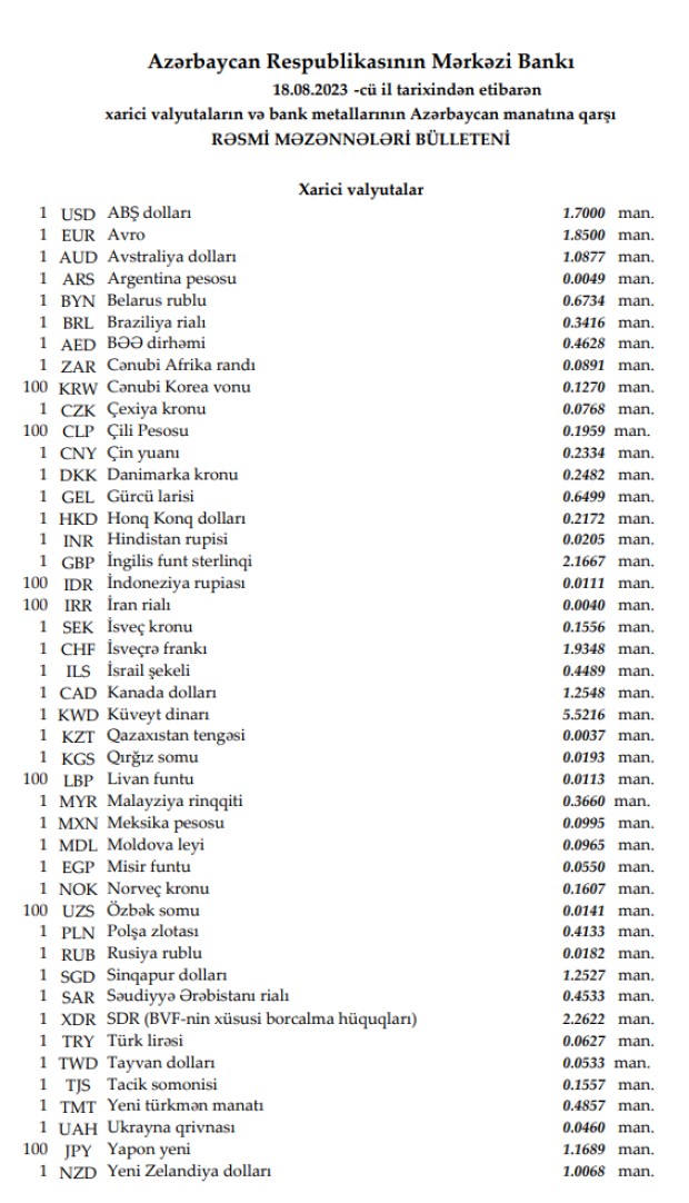 Dolların bazar ertəsi üçün rəsmi məzənnəsi müəyyən olunub