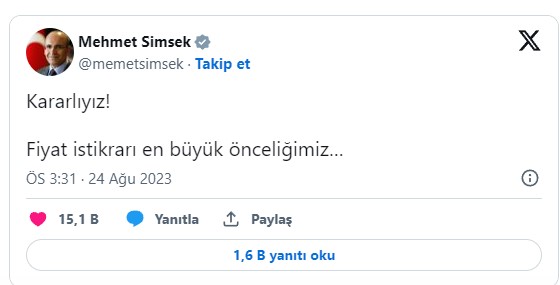 Türkiyənin Xəzinə və maliyyə naziri Mehmet Şimşek sosial media hesabında Türkiyə Cümhuriyyəti Mərkəzi Bankının (TCMB) "şahin" faiz qərarından sonra qiymət sabitliyi mövzusunda qərarlı olduqlarını bildirib.Türkiyənin Xəzinə və maliyyə naziri Mehmet Şimşek Türkiyə Cümhuriyyəti Mərkəzi Bankının (TCMB) faiz dərəcəsini 7,50 bənd artırmasından sonra sosial media hesabından paylaşım edib.
