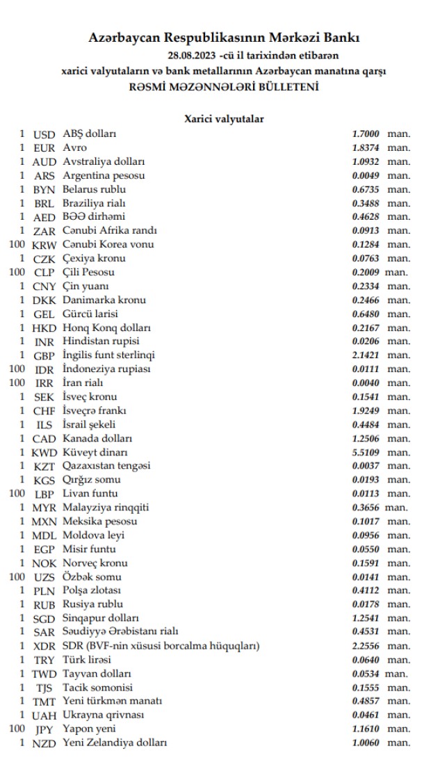 Dolların bazar ertəsi üçün rəsmi məzənnəsi müəyyən olunub