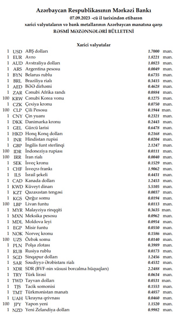 Dolların bazar ertəsi üçün rəsmi məzənnəsi müəyyən olunub