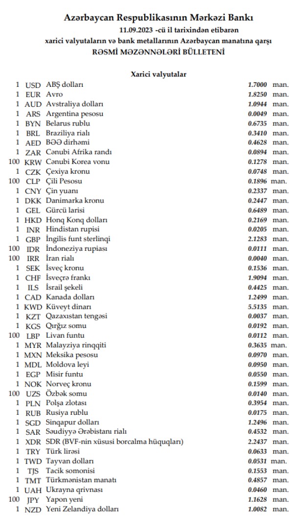 Dolların bazar ertəsi üçün rəsmi məzənnəsi müəyyən olunub