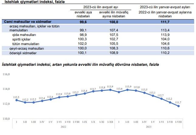 Xatırladaq ki, 2023-cü ilin yanvar-iyul aylarında istehlak qiymətləri indeksi 2022-ci ilin yanvar-iyul aylarına nisbətən 12,2 faiz artmışdı. 2023-cü ilin iyul ayında istehlak qiymətləri indeksi əvvəlki aya nisbətən 0,7 faiz azalmış, əvvəlki ilin iyul ayına nisbətən 9,4 faiz artmışdı.
