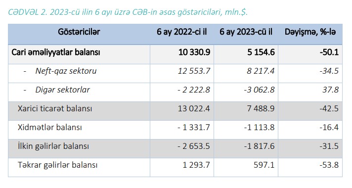 2023-cü ilin 6 ayı üzrə Azərbaycanın cari əməliyyatlar hesabının profisiti 5.2 milyard və ya ÜDM-in 14.5%-ni təşkil edib (2022-ci ilin 6 ayı üzrə 10.3 milyard profisit olmuşdu).