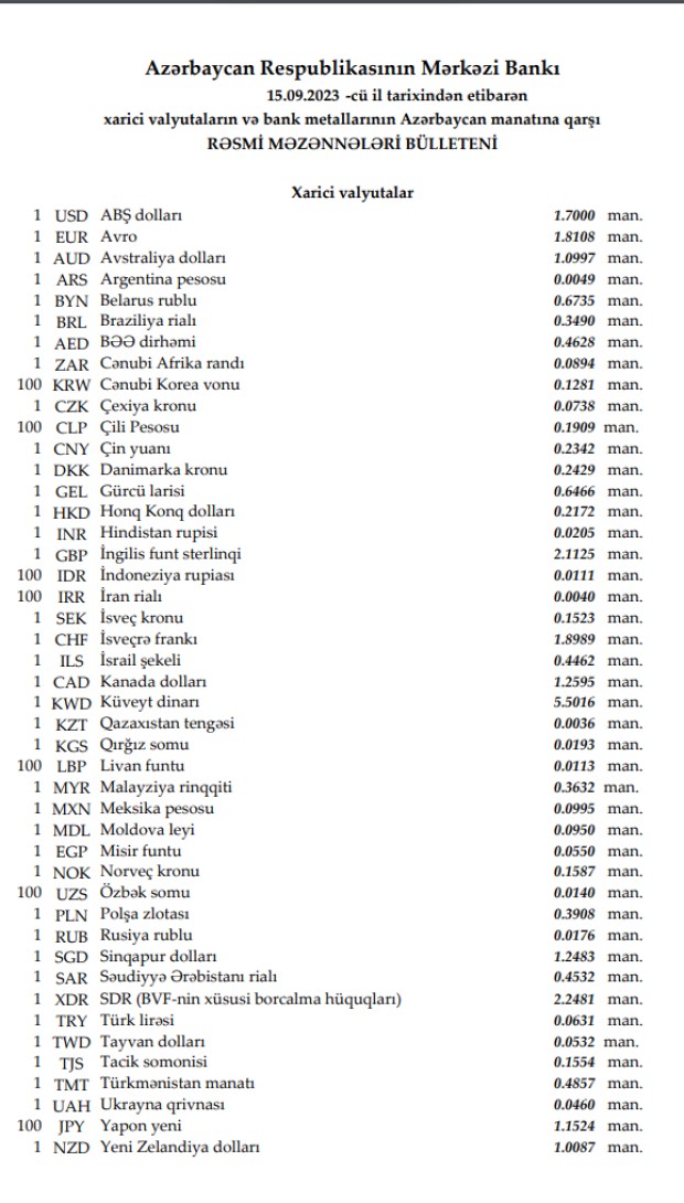 Dolların bazar ertəsi üçün rəsmi məzənnəsi müəyyən olunub