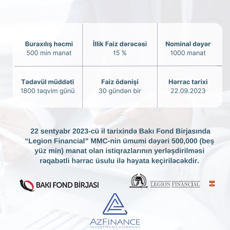 “Legion Financial” istiqrazlarının yerləşdirilməsi üzrə hərrac keçiriləcək - 15 % GƏLİR TƏKLİFİ