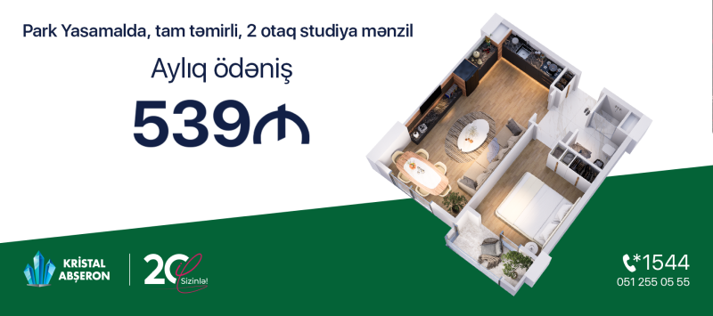 (®) “Kristal Abşeron”dan kirayədən sərfəli təklif var! Aylıq 539 manat ödəməklə tam təmirli, 2 otaq studiya mənzilə sahib olmaq imkanı “Park Yasamal”da. Satışa çıxan yeni mərhələdə həmçinin 2, 3 və 4 otaqlı mənzillər də mövcuddur.