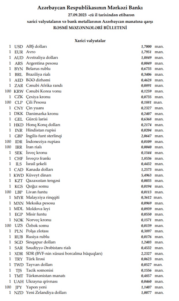 Rəsmi məzənnələr açıqlandı