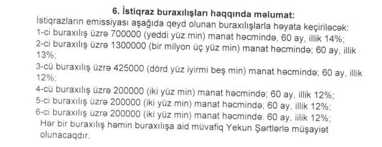 İstiqrazların 1-ci buraxılışı ilə 700 min manat, 2-ci buraxılışı ilə 1 milyon 300 min manat, 3-cü buraxılışı ilə 425 min manat, 4-cü buraxılışı ilə 200 min manat, 5-ci buraxılışı ilə 200 min manat, 6-cı buraxılışı ilə də 200 min manat cəlb edilməsi nəzərdə tutulur.