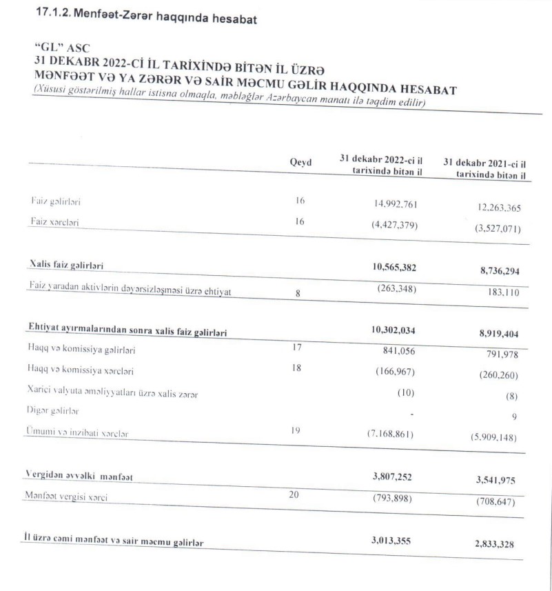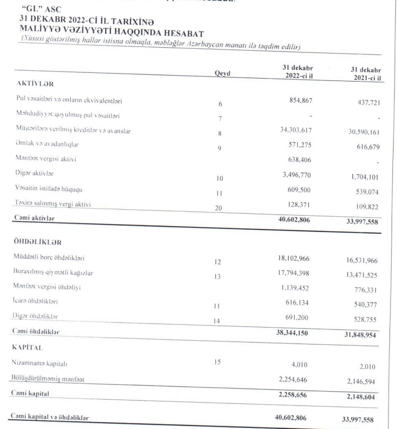 "GL" ASC sürətlə böyüyən kredit şirkətidir. Belə ki, "GL" ASC-nin xalis mənfəəti 2020-ci ildə 1 milyon 15 min manat ikən, 2021-ci ildə 2 milyon 833 min manata, 2022-ci ildə isə 3 milyon 13 min manata yüksəlib. Eyni dövrdə şirkətin kredit portfeli 23 milyon 89 min manatdan 34 milyon 304 min manata qalxıb. Ötən ilin sonunda "GL" ASC-nin cəmi aktivləri 40 milyon 603 min manata çatıb.