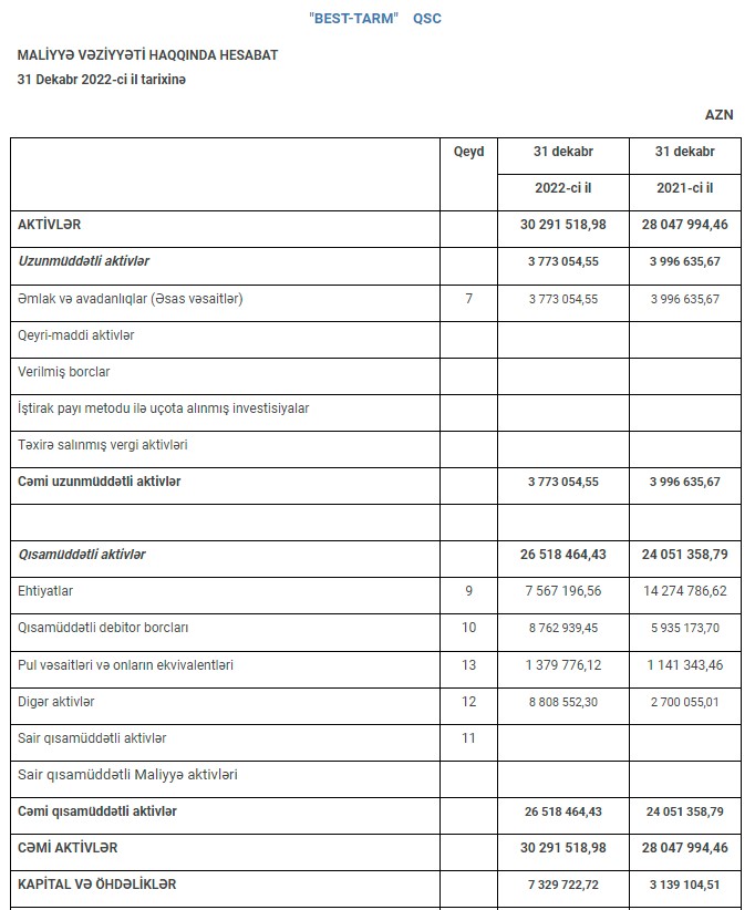 31 dekabr 2022-ci il tarixində "BEST-TARM" QSC 30 milyon 292 min manat cəmi aktivlərə malik olub. Şirkət 2021-ci ilin sonunda 28 milyon 48 min manat cəmi aktivlərə malik idi.