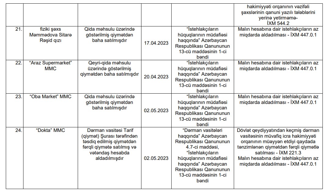İstehlakçı hüquqlarının müdafiəsi və istehlak bazarına nəzarət sahəsində sahibkarlıq fəaliyyəti ilə məşğul olan fiziki və hüquqi şəxslər barədə tərtib olunmuş protokollara dair ətraflı məlumat:
