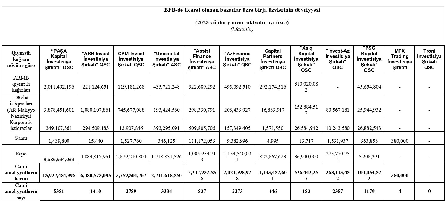 Marja.az xəbər verir ki, “PAŞA Kapital İnvestisiya Şirkəti” QSC 15 milyard 927 milyon 485 min manat dövriyyə ilə 1-ci, "ABB İnvest İnvestisiya Şirkəti" QSC 6 milyard 480 milyon 575 min manat dövriyyə ilə 2-ci və" CPM-İnvest İnvestisiya Şirkəti" QSC 3 milyard 759 milyon 505 min manat dövriyyə ilə 3-cü olub.