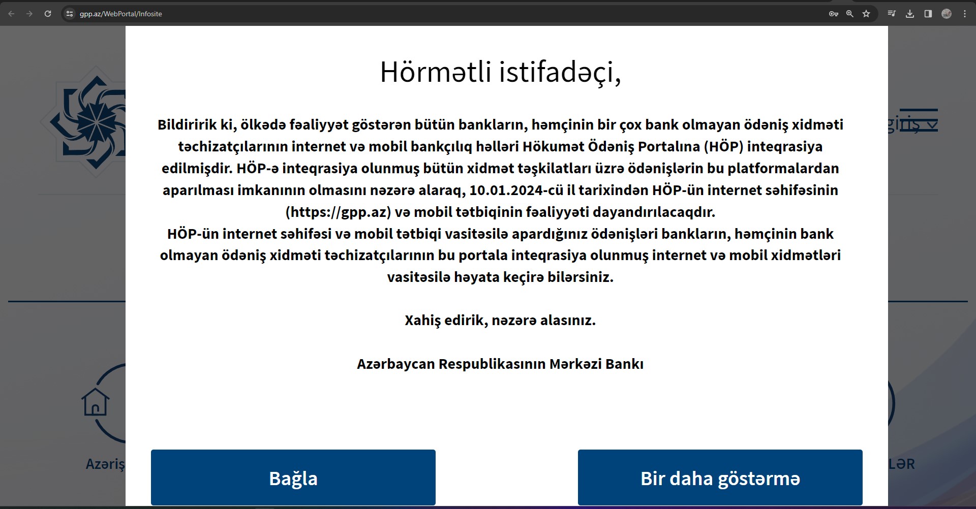 Azərbaycandakı bankların, əksər bank olmayan ödəniş xidməti təchizatçılarının internet və mobil bankçılıq həllərinin Hökumət Ödəniş Portalına (HÖP) inteqrasiya edildiyi, bütün xidmət təşkilatları üzrə ödənişlərin bu platformalardan aparılması imkanı olduğu nəzərə alınaraq 10 yanvar 2024-cü ildən HÖP-ün internet səhifəsinin (https://gpp.az) və mobil tətbiqinin fəaliyyəti dayandırılacaq.
