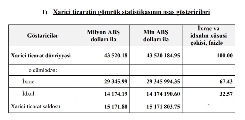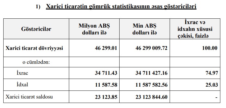 Beləliklə, Azərbaycanın xarici ticarət əməliyyatlarının həcmi 6%, o cümlədən ixracı 15,5% azalıb, idxalı isə 22,3% artıb. Müsbət saldo isə 7 milyard 952 milyon 41 min dollar və ya 34,4% azalıb.
