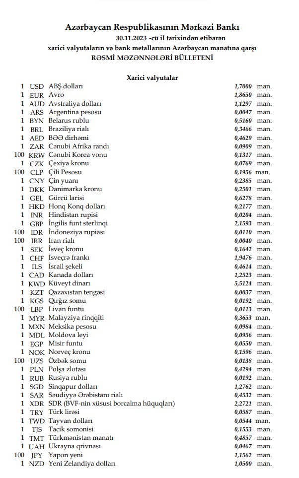 Rəsmi məzənnələr açıqlandı