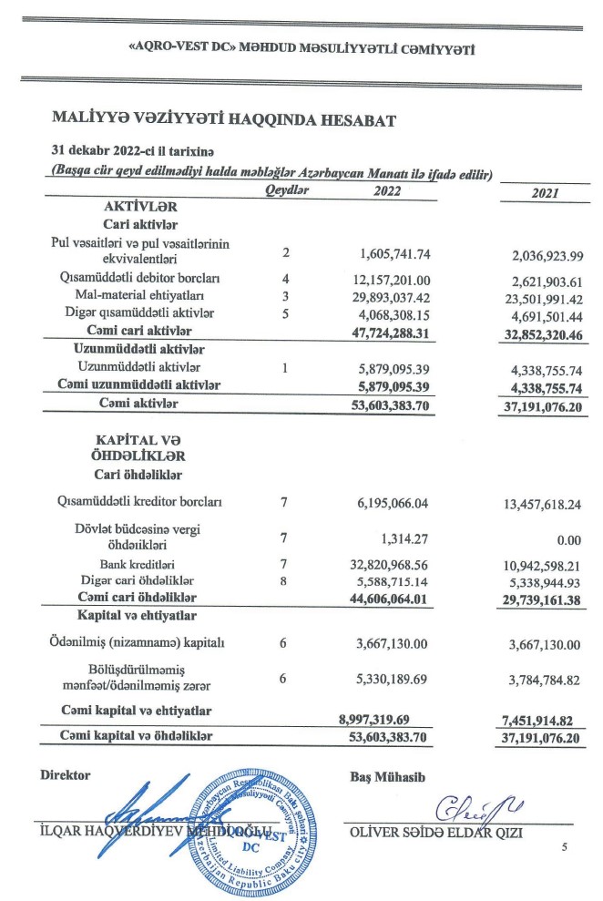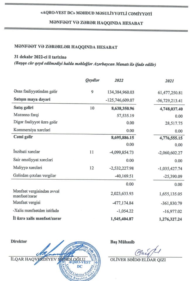 Ötən il "AQRO - VEST DC" MMC-nin inzibati və maliyyə xərclərinin iki dəfədən çox artması satışın artmasından qaynaqlanan gəlirin böyük hissəsini silib.