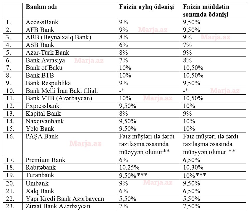 “Marja.az”ın araşdırmasına əsasən, bu günə olan məlumata görə, 12 ay müddəti üzrə ən yüksək əmanət faizlərini Bank of Baku, Bank BTB, Bank VTB Azərbaycan, Rabitəbank, Expressbank, Naxçıvanbank, Yelo Bank və Turanbank təklif edir.