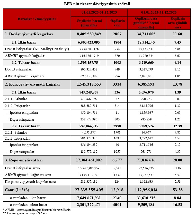 Bakı Fond Birjasında 2023-cü ilin yanvar-dekabr ayları ərzində qiymətli kağızlar üzrə keçirilən əməliyyatların ümumi həcmi 27 milyard 335 milyon 355 min manat təşkil edib. Birjanın yaydığı məlumatda bildirilir ki, 2022-ci ilin müvafiq dövrü ilə müqayisədə əməliyyatların ümumi həcmi 83% artıb.