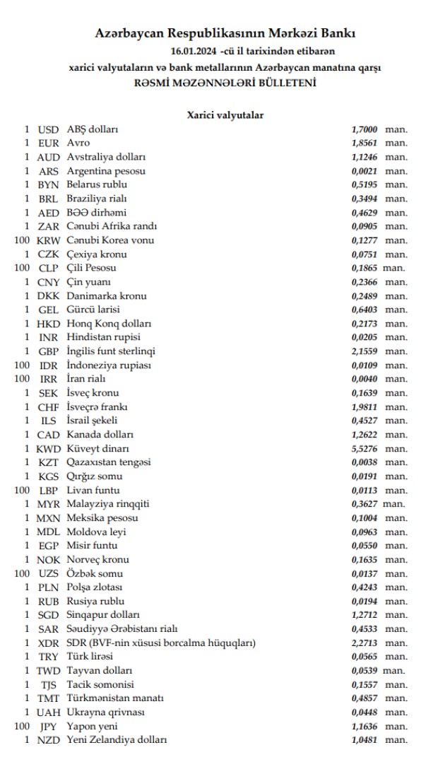 Rəsmi məzənnələr açıqlandı
