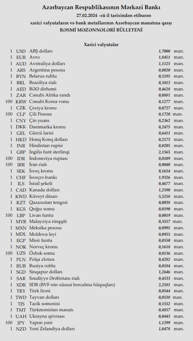Rəsmi məzənnələr açıqlandı