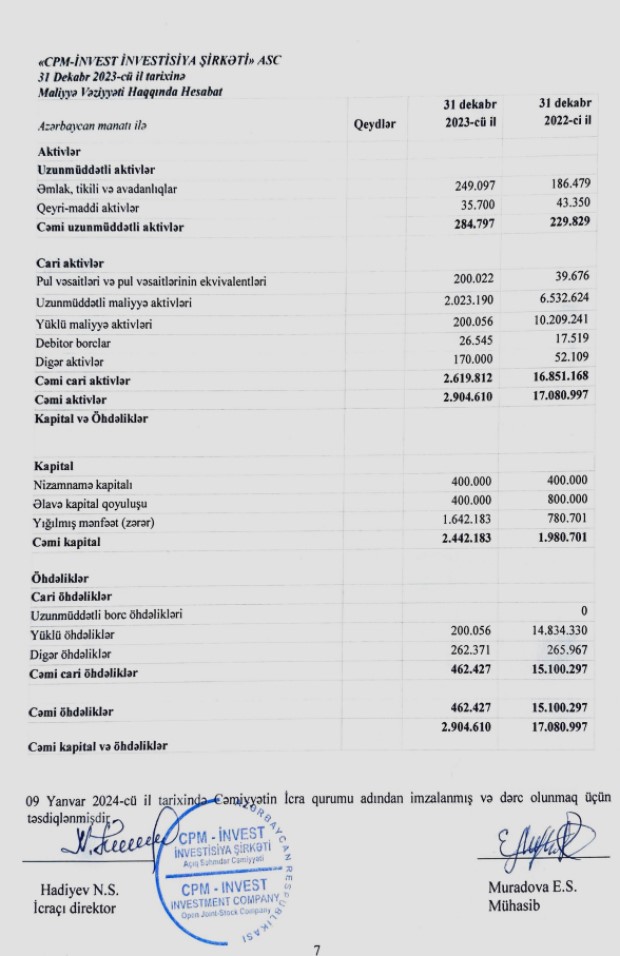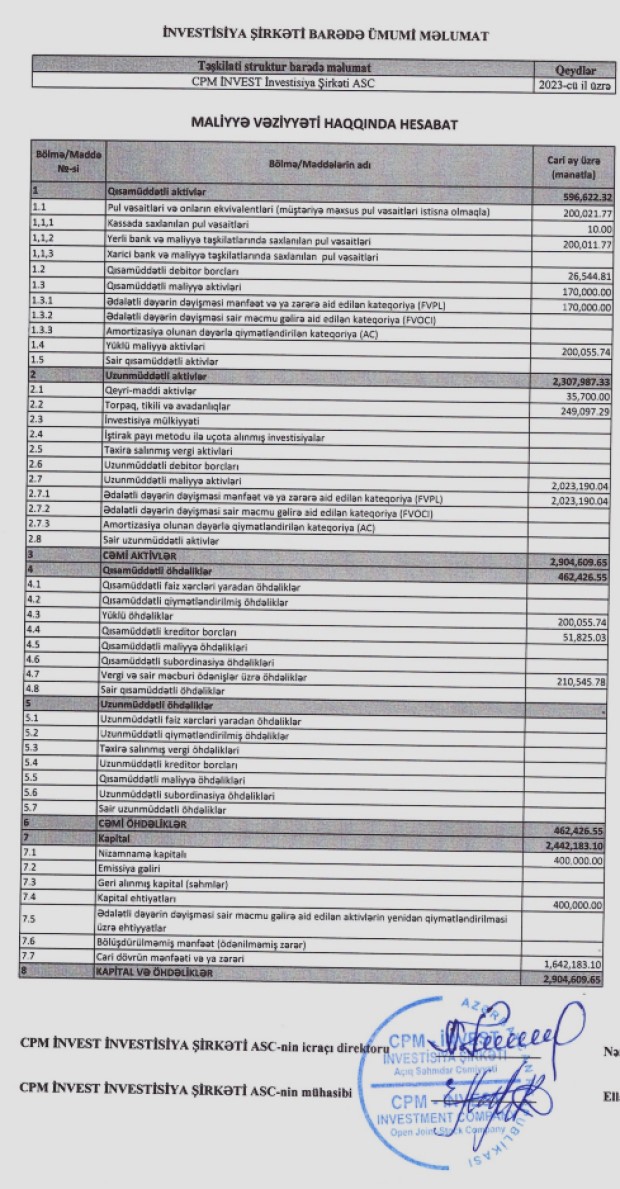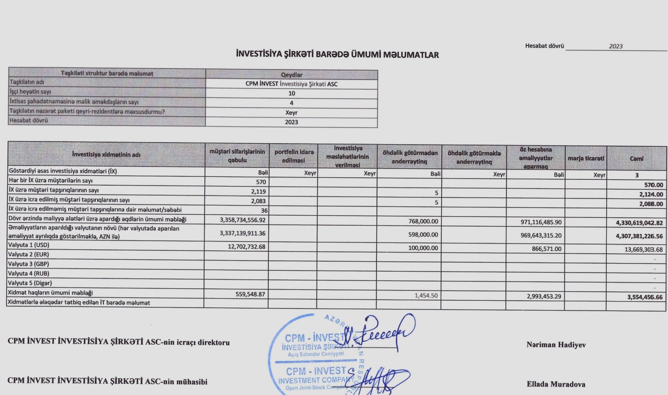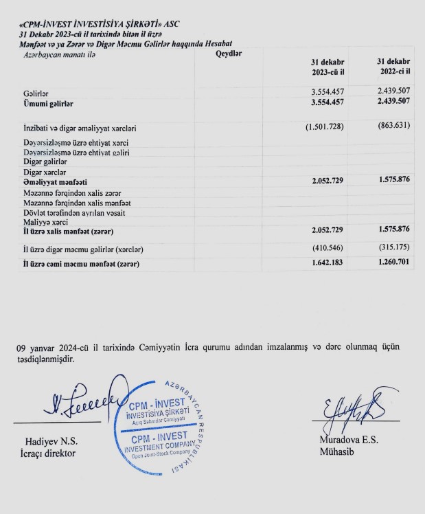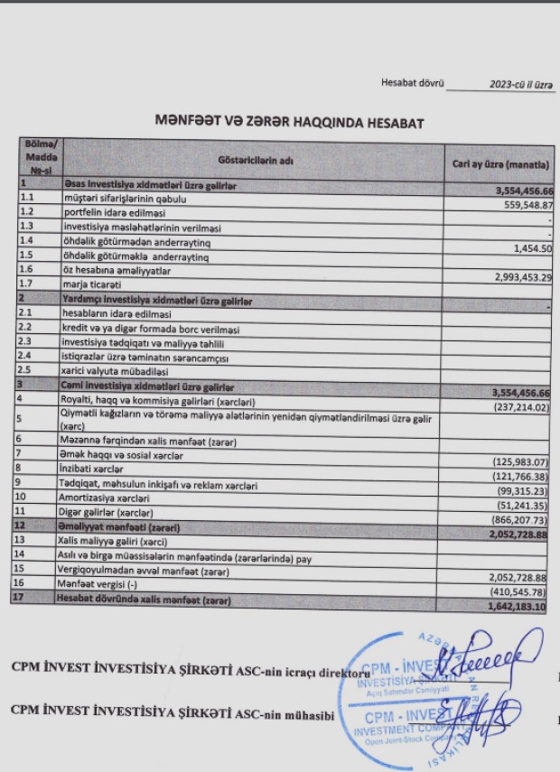 "CPM İnvest İnvestisiya Şirkəti”nin gəlirləri 2021-ci ildə 1 milyon 26 min manat, 2022-ci ildə 2 milyon 440 min manata təşkil etmişdi. Beləliklə, “CPM İnvest"in gəlirləri 2023-cü ildə 2022-ci illə müqayisədə 1 milyon 114 min manat və ya 45,6% artıb.