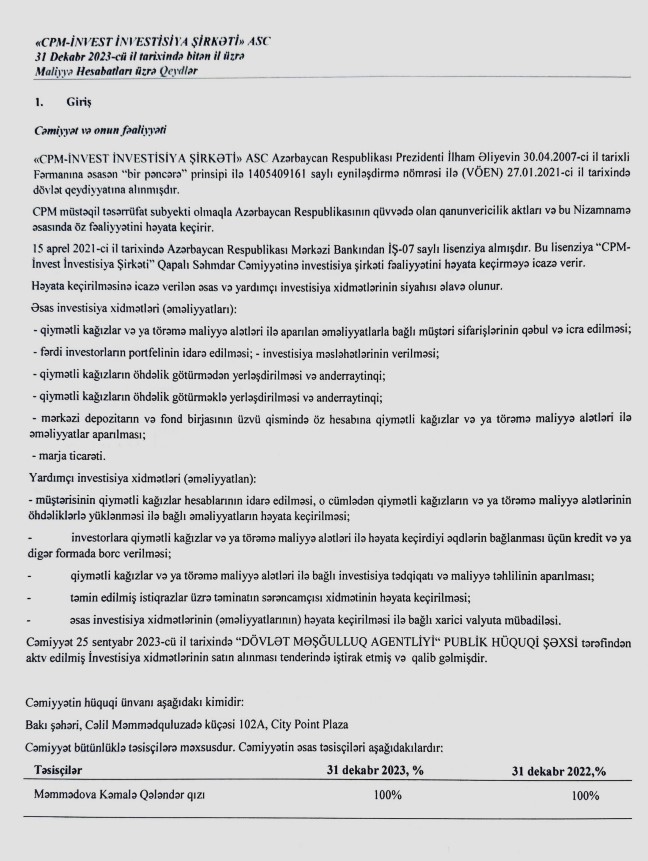 "CPM İnvest İnvestisiya Şirkəti" ASC-nin nizamnamə kapitalının 100%-i Məmmədova Kəmalə Qələndər qızına məxsusdur.