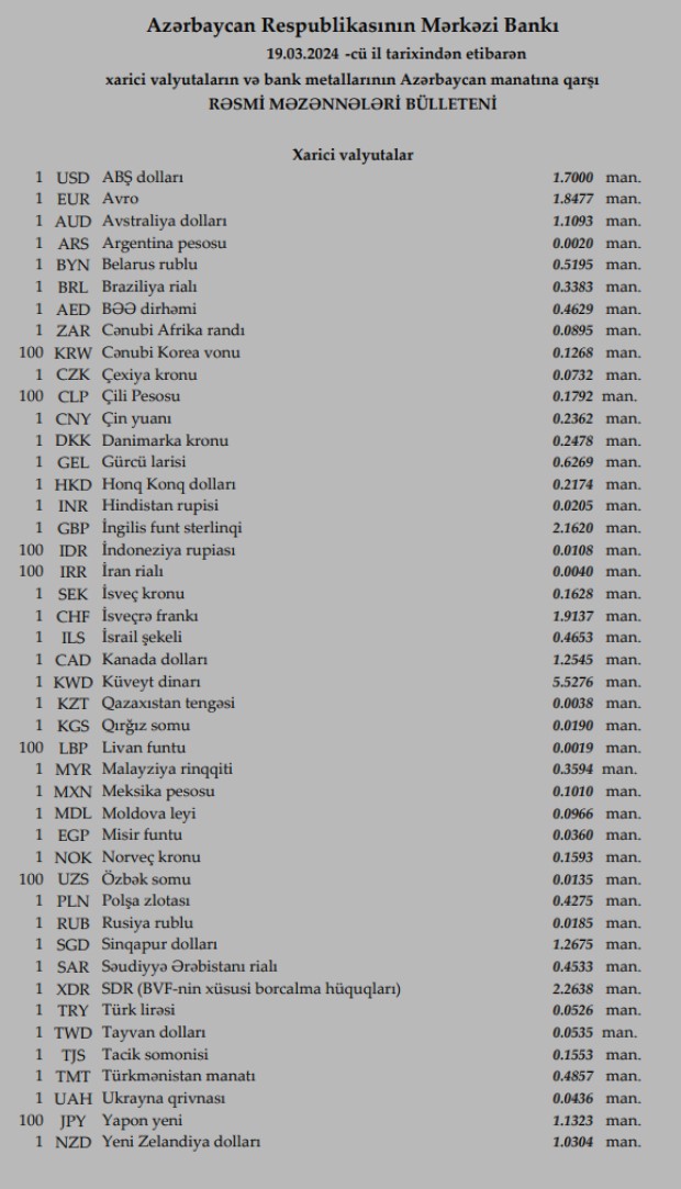 Dolların Bazar ertəsi üçün rəsmi məzənnəsi müəyyən olunub